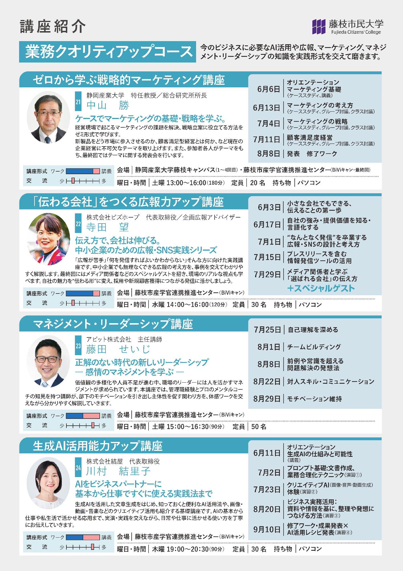 「広報が苦手」「何を発信すればよいかわからない」そんな方に向けた実践講座です。中小企業でも無理なくできる広報の考え方を、事例を交えてわかりやすく解説します。最終回にはメディア関係者などのスペシャルゲストを招き、現場のリアルな視点も学べます。自社の魅力を“伝わる形”に変え、採用や新規顧客獲得につながる発信に活かしましょう。(全5講義)