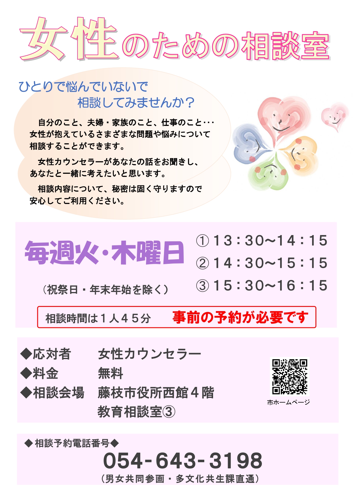| 相談日時 | 毎週 火曜日・木曜日 (1) 午後1時30分~午後2時15分 (2) 午後2時30分~午後3時15分 (3) 午後3時30分~午後4時15分 市役所が休みのときはありません。 |