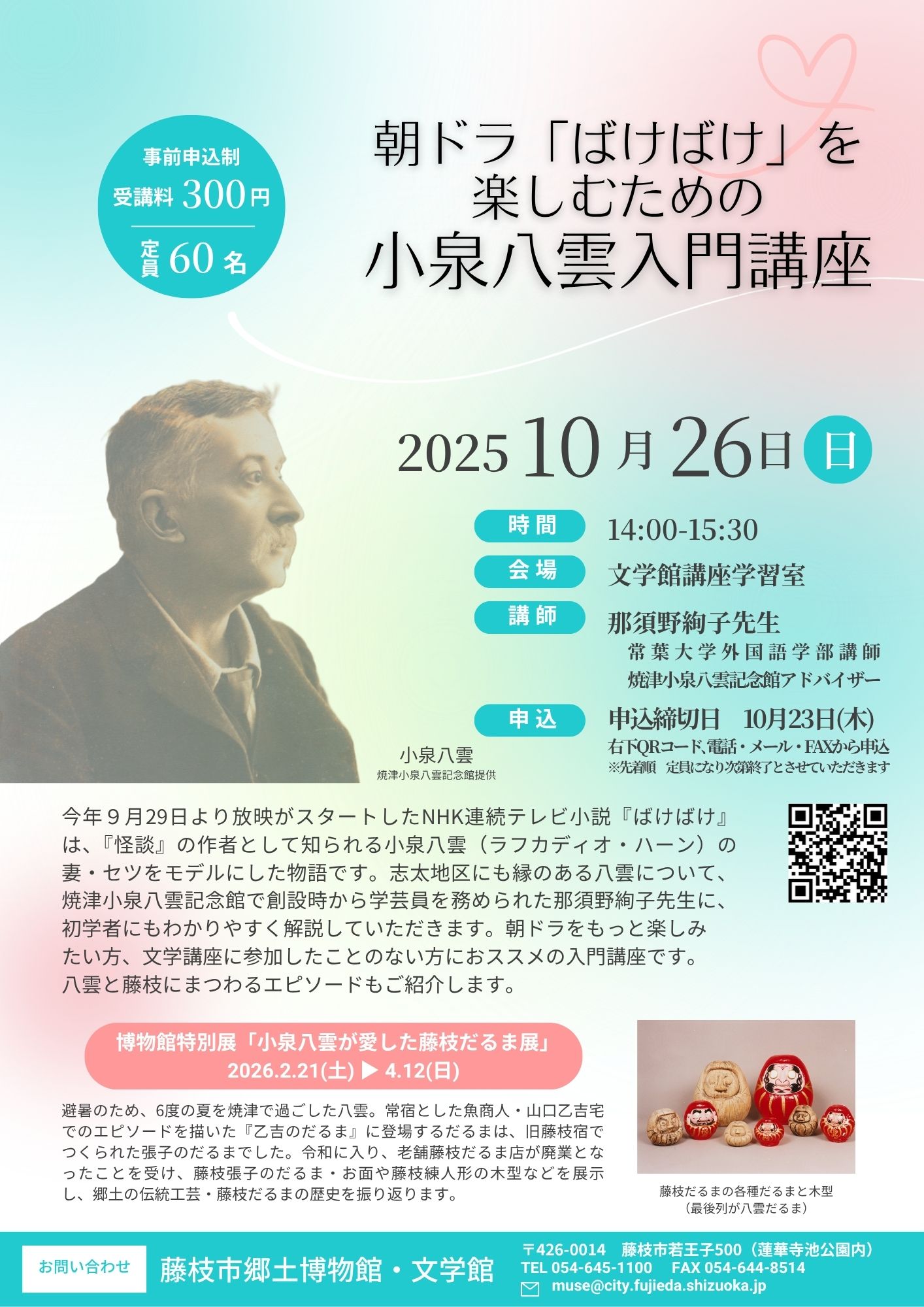 開催日時は10月26日(日曜日)午後2時~3時30分です!*広報ふじえだの記載に誤りがありました。 (誤)10月25日(土曜日)→(正)10月26日(日曜日) 放映中のNHK朝の連続テレビ小説「ばけばけ」は、『怪談』の作者として知られる小泉八雲(ラフカディオ・ハーン)の妻・セツをモデルにした物語です。志太地区にも縁のある八雲について、焼津小泉八雲記念館で創設時から学芸員を務めた那須野絢子先生に、初学者にも分かりやすく解説していただきます。八雲と焼津、藤枝にまつわるエピソードもご紹介いただきます。 朝ドラをもっと楽しみたい方におススメの入門講座です。 |