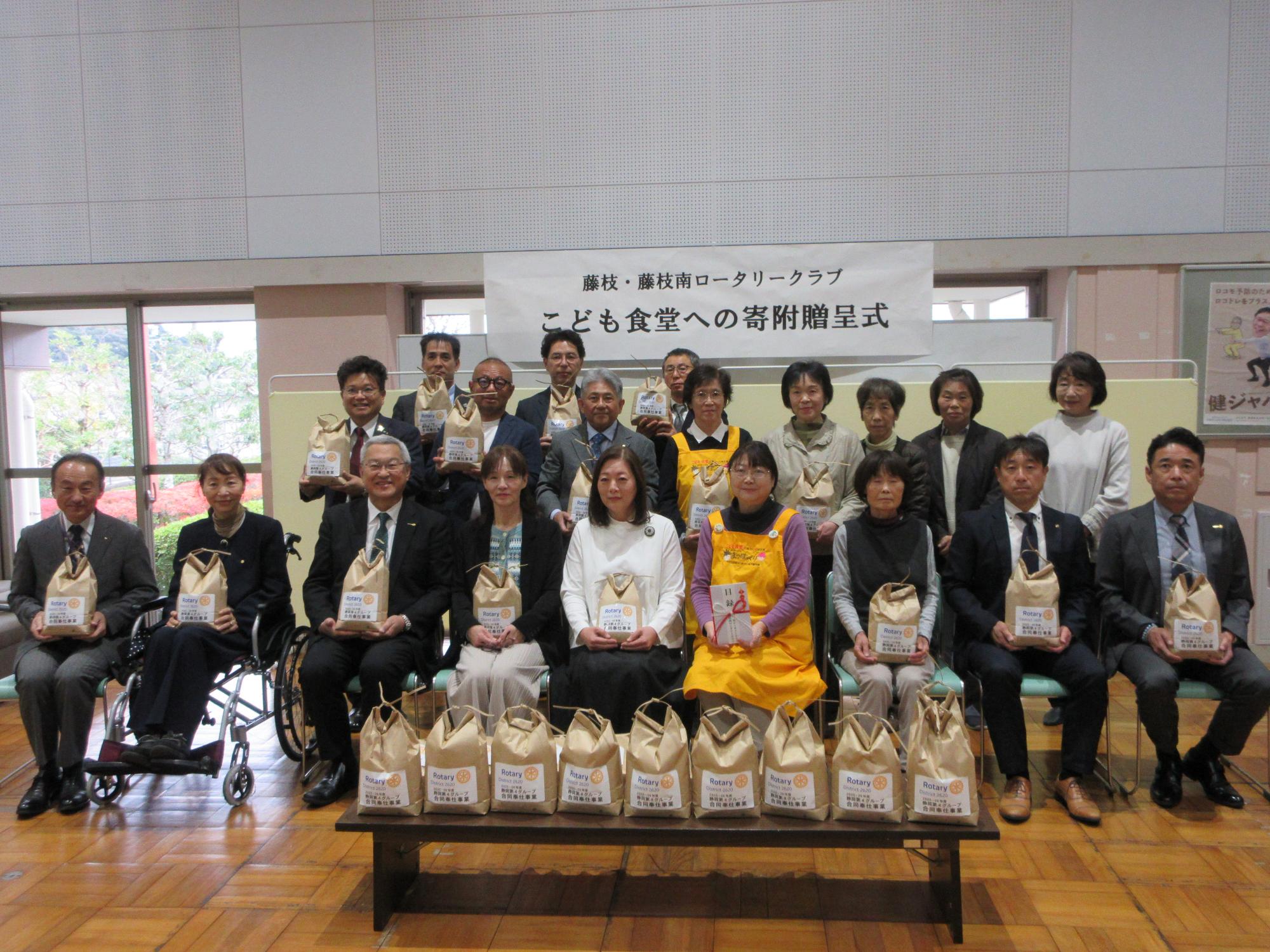 令和7年11月13日、藤枝・藤枝南ロータリークラブ様より、「どんな境遇のこどもたちも未来に希望を抱き、笑顔で暮らせる社会づくり」を目的として、市内こども食堂実施団体へ、お米と寄付金をいただきました。