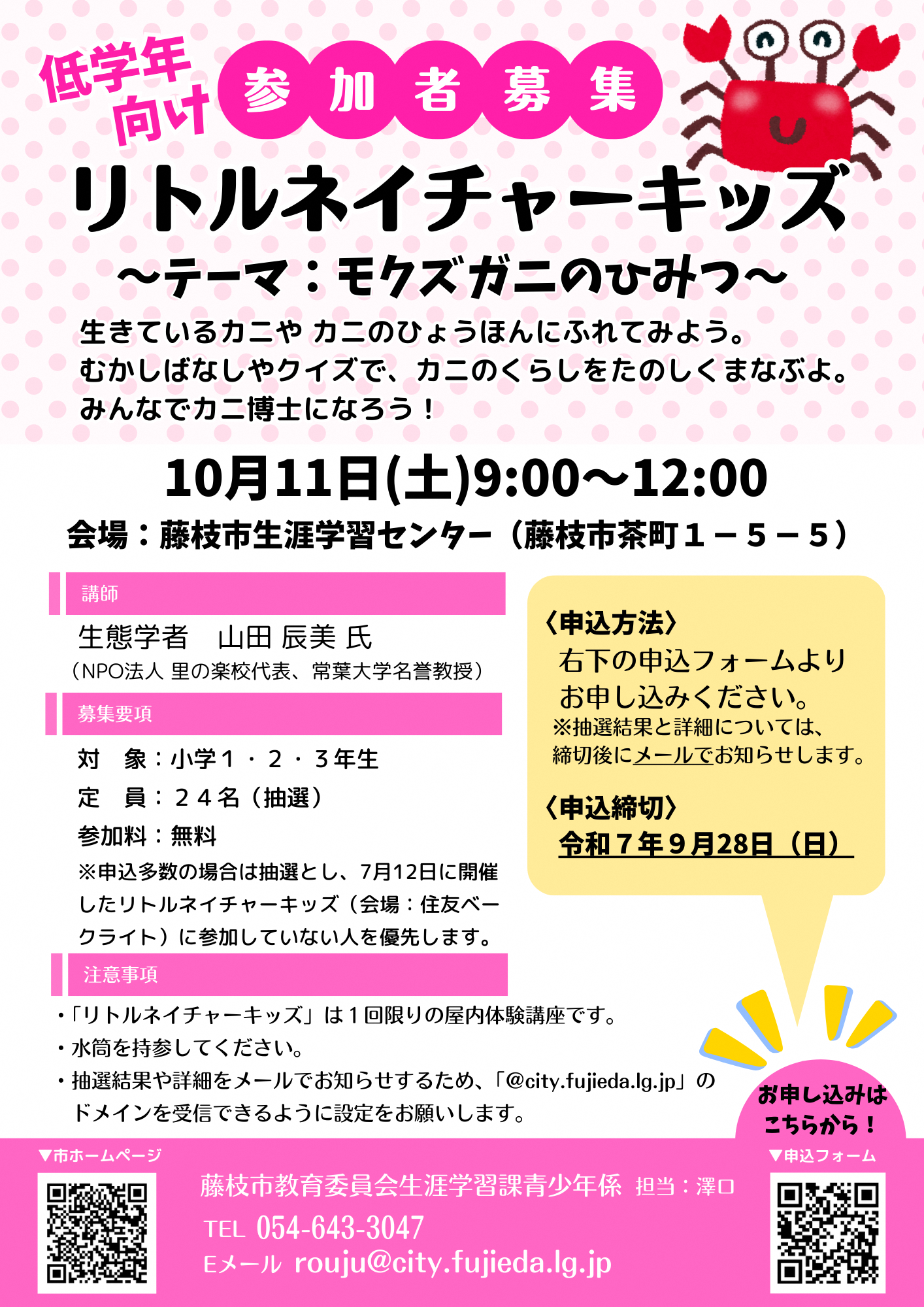 『リトルネイチャーキッズ』は、藤枝の豊かな自然の中で行う体験教室「藤枝ネイチャーキッズ」の低学年向け教室です。