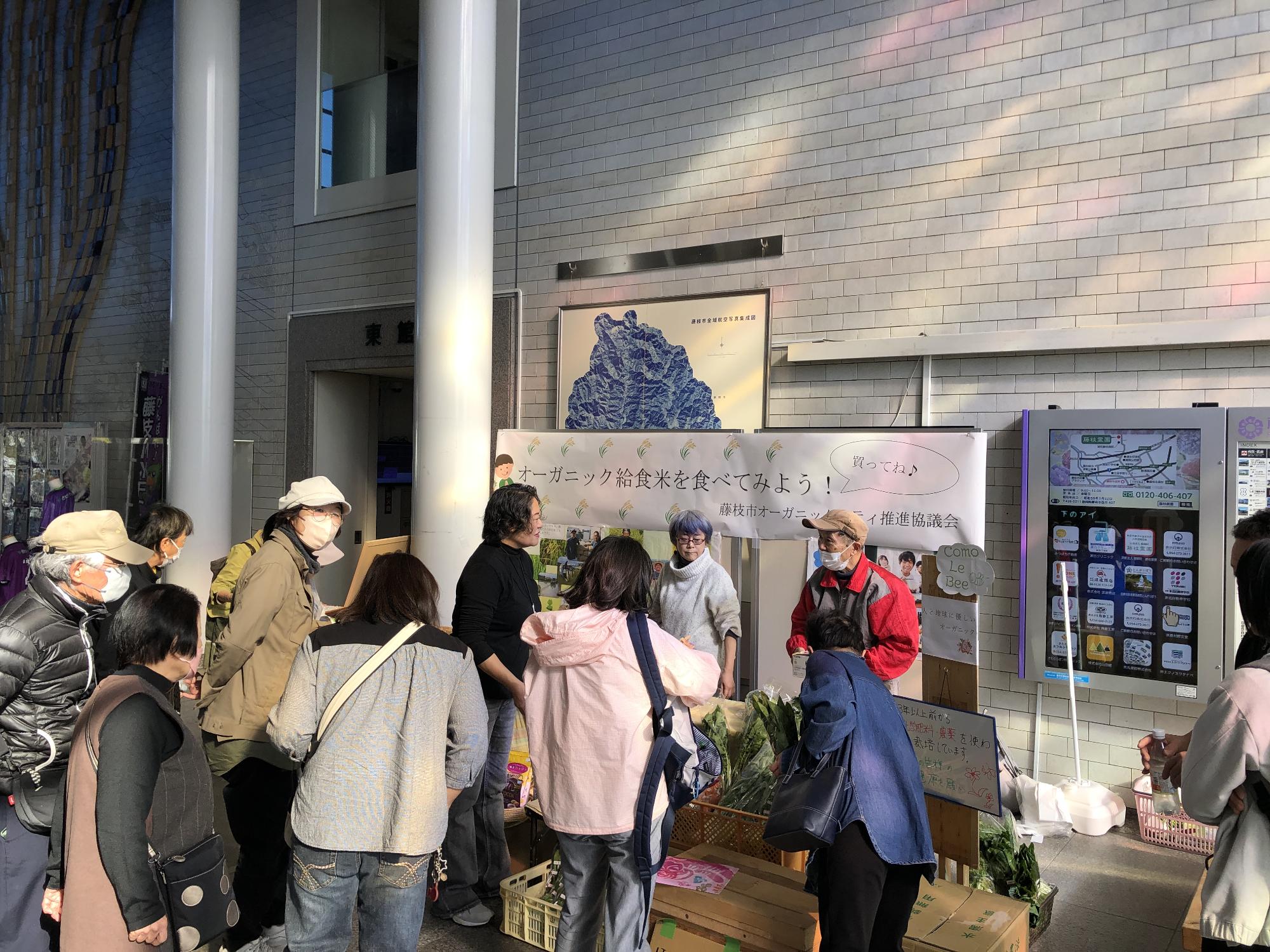 また、同日に、市役所ロビーで、有機農産物のPRイベントを実施しました。学校給食への有機農産物の提供が開始したことをPRするとともに、学校給食に提供されている有機米を使ったおむすびや有機農産物、フェアトレード製品等の販売を行いました。
