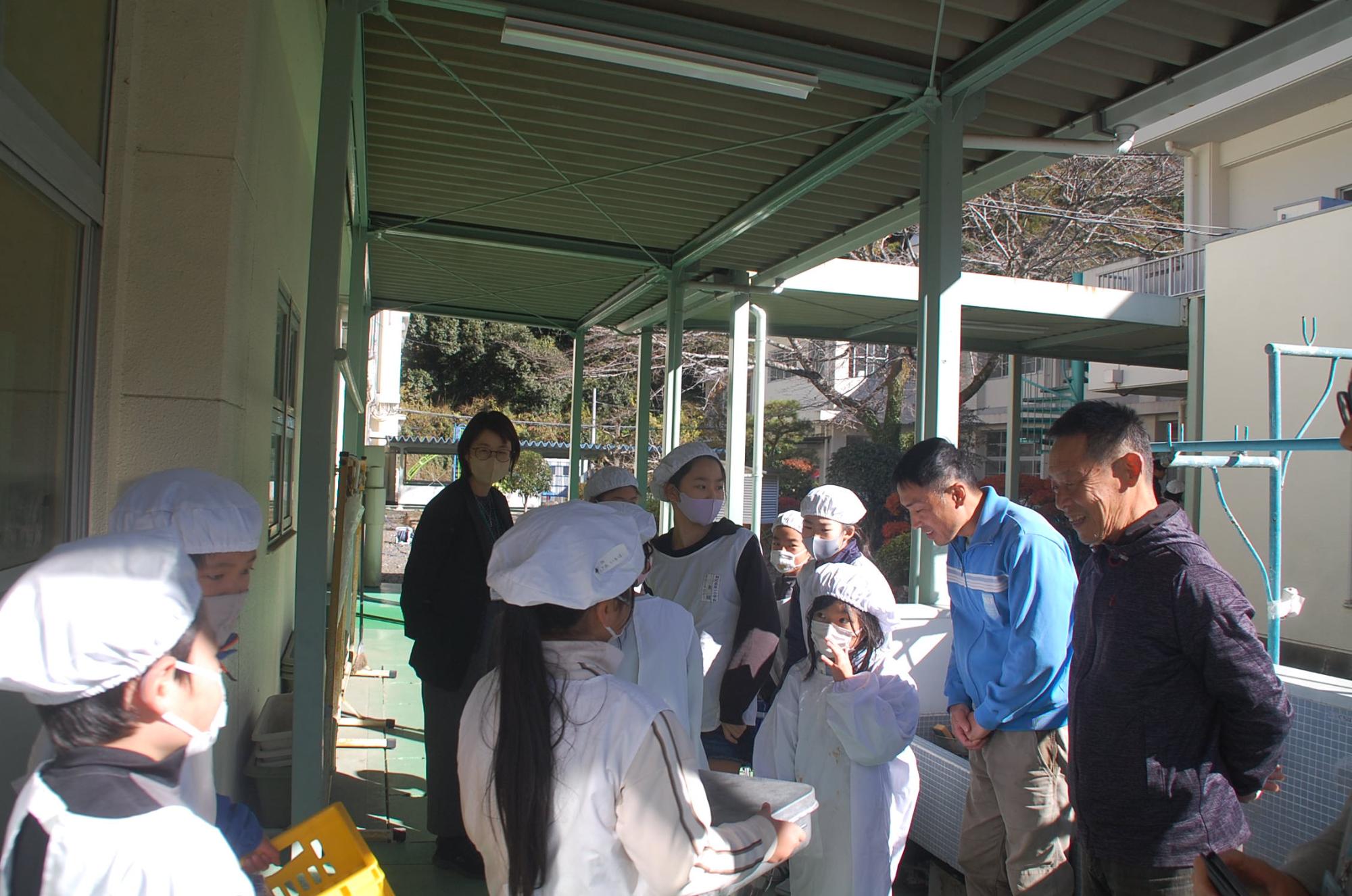 有機農産物の提供に伴い、令和7年12月4日に、藤枝市オーガニックシティ推進協議会の松下会長、三木コーディネーター、有機米生産者の山口さんの3名が、朝比奈第一小学校を訪問しました。