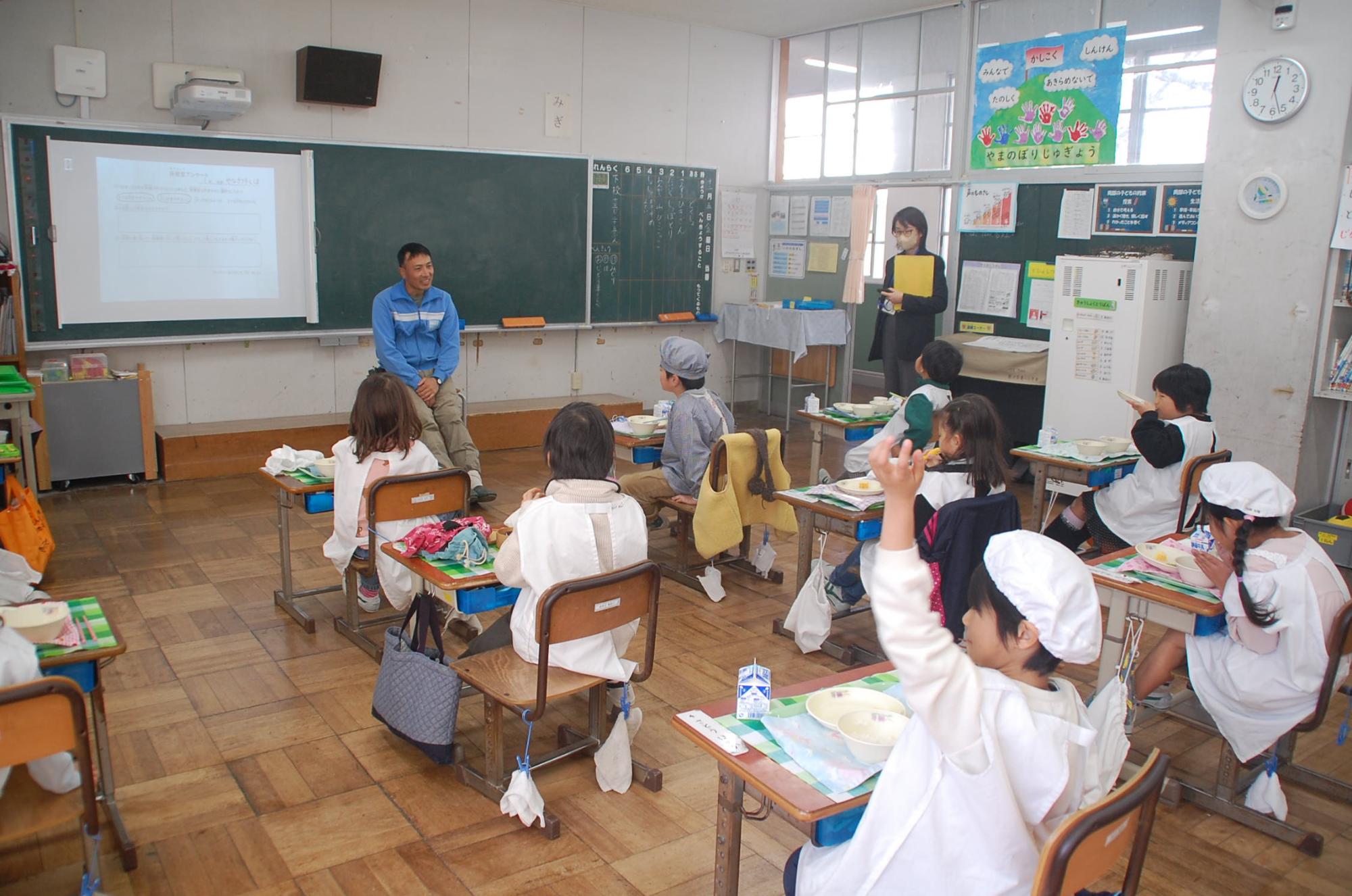 全校児童が配膳係を担っているため、まずは、給食室前で顔合わせを行い、その後各教室で、有機農業の素晴らしさや有機農業を行う大変さについて、お話をしました。各家庭で、田んぼや畑を行っている児童も多く、真剣に話を聞いてくれました。また、児童だけでなく先生からも前のめりに質問が出て、大変盛り上がりました。