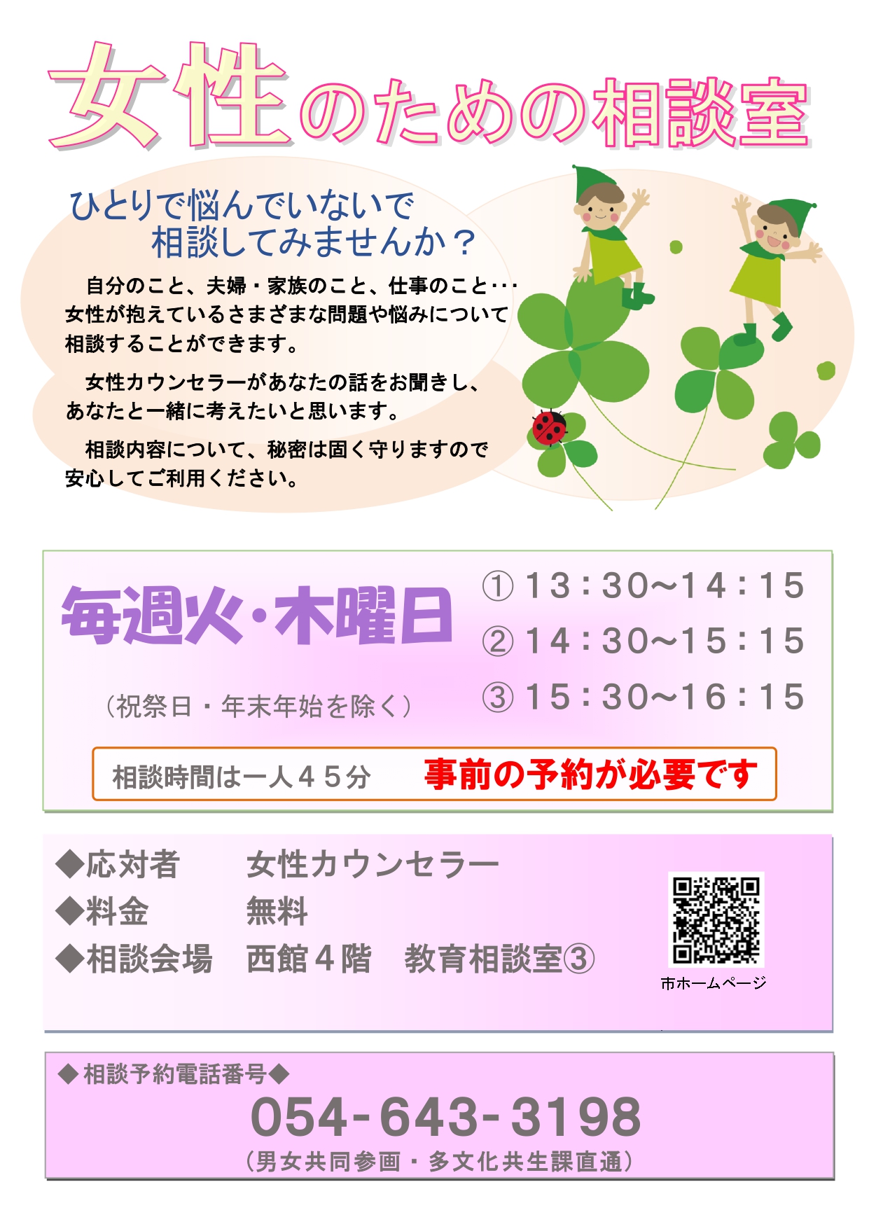 女性のための相談室は、対面または電話による相談を行っています。