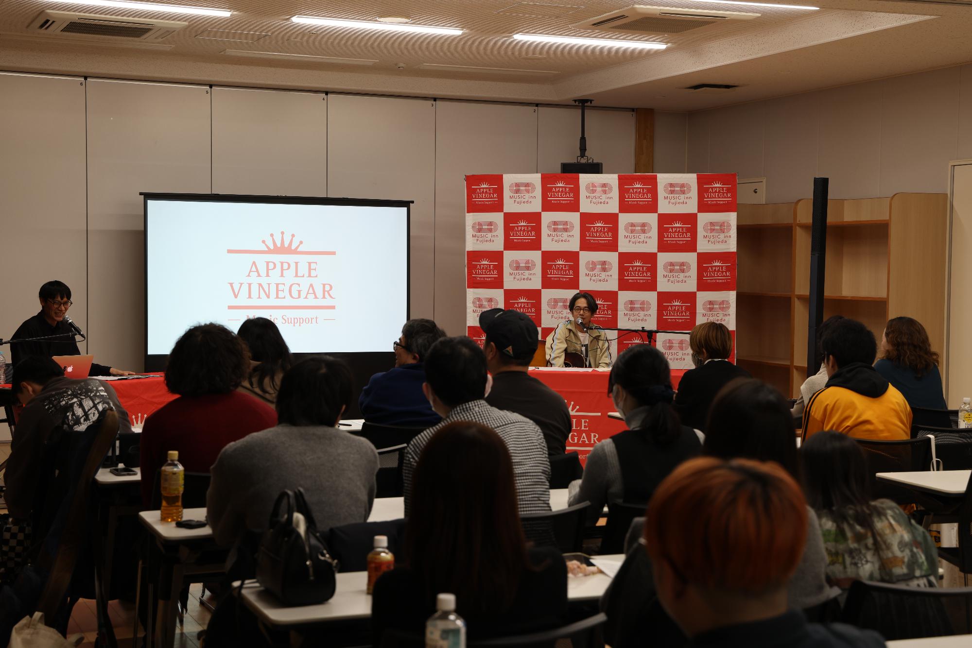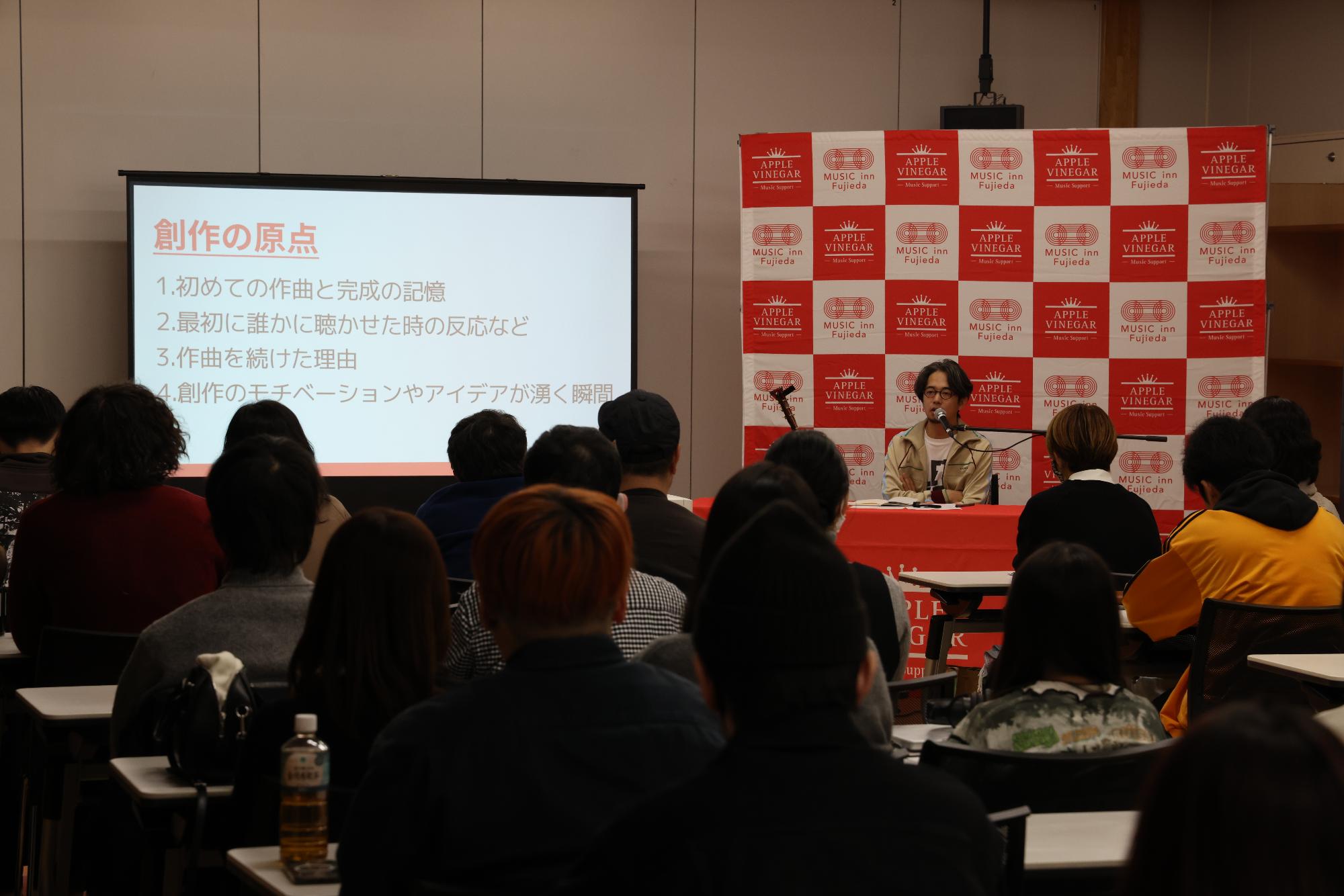 ホストにギタリストの井上陽介さんを、講師にASIAN KUNG-FU GENERATIONのボーカル&ギターの後藤正文さんをお迎えし、公募で集まった約50名の参加者に対し、講師の体験紹介や楽曲解説、創作体験や弾き語りライブを通して音楽制作の楽しさをお伝えしました。
