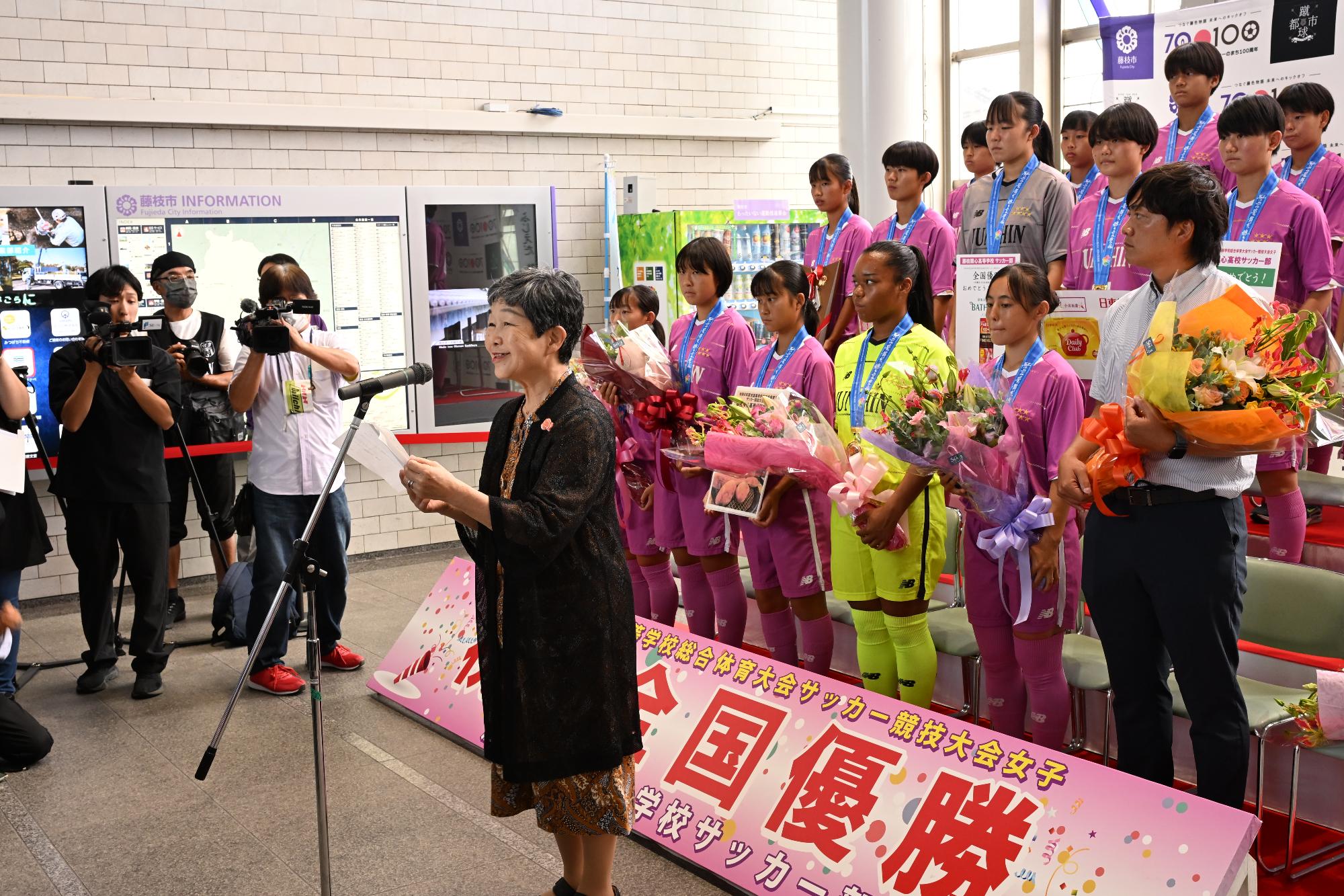 令和6年度全国高等学校総合体育大会サッカー競技大会女子において、藤枝順心高等学校サッカー部が2年連続3度目の優勝を果たしたことを祝い、8月23日(金曜日)に藤枝市役所1階ロビーにて、優勝報告会を開催しました。