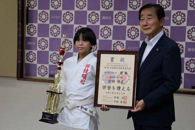 第56回全国中学校柔道大会で日本一!~藤枝順心中学校柔道部2年生 吉田唯良選手が市長を表敬訪問しました~