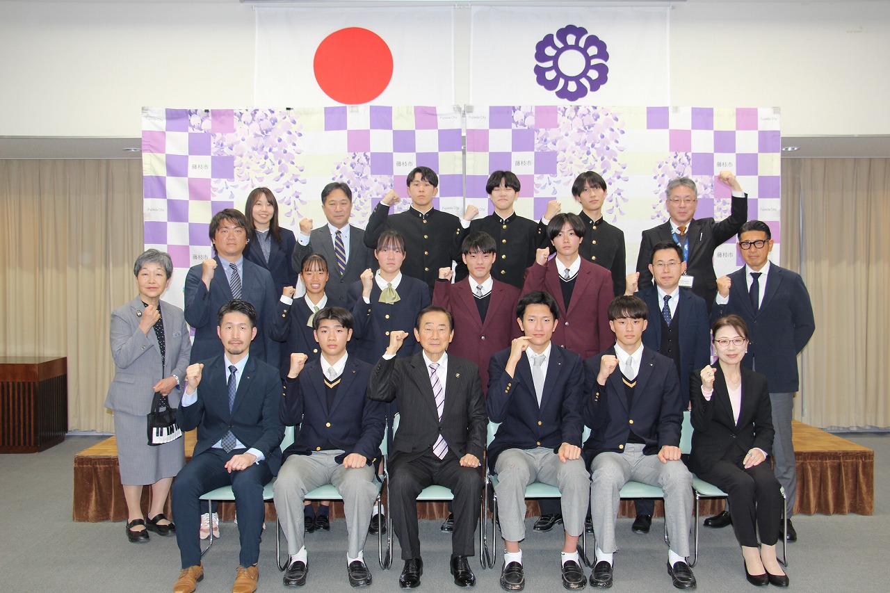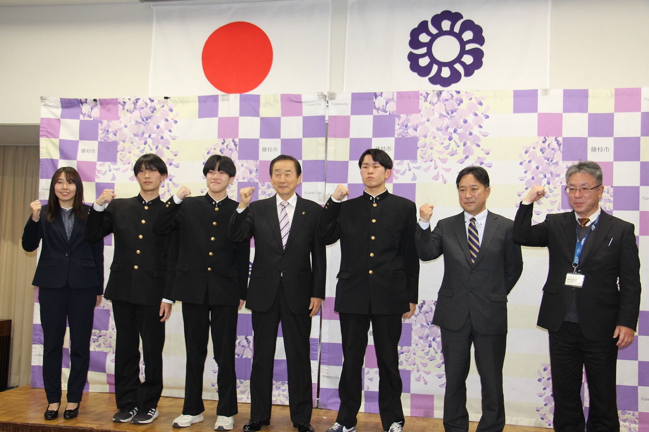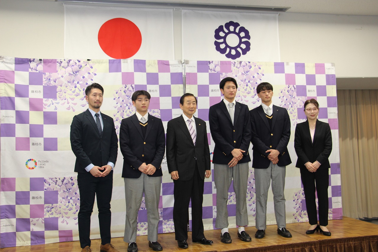 12月11日(木曜日)、この冬に全国大会へ出場する4校(藤枝東高校弓道部、藤枝明誠高校バスケットボール部、藤枝順心高校サッカー部、静清高校バレーボール部)の生徒たちが、大会前に市長を表敬訪問しました。