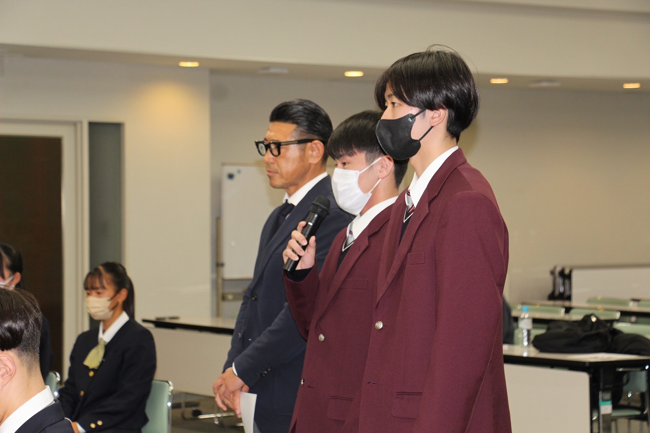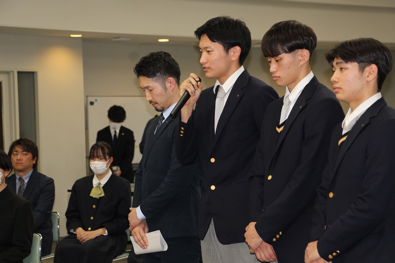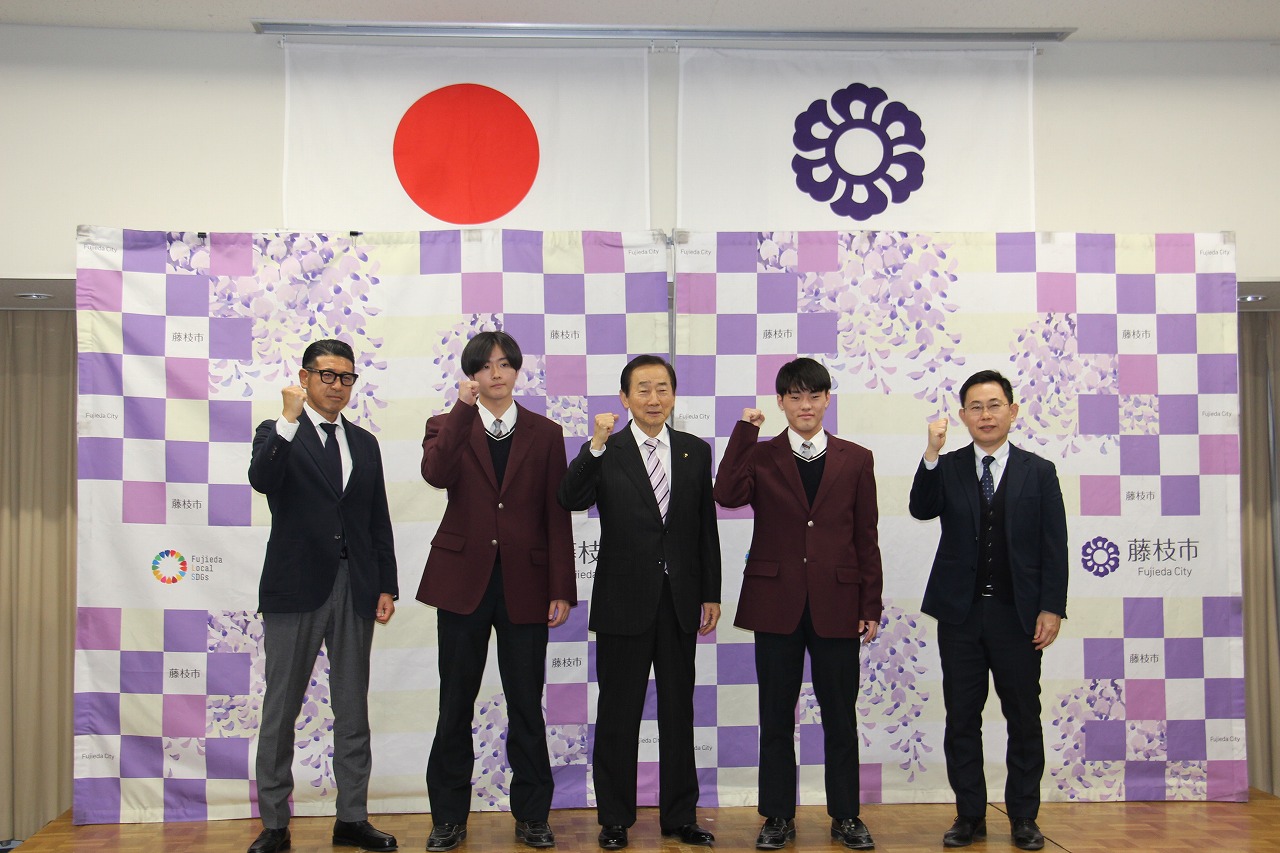 12月11日(木曜日)、この冬に全国大会へ出場する4校(藤枝東高校弓道部、藤枝明誠高校バスケットボール部、藤枝順心高校サッカー部、静清高校バレーボール部)の生徒たちが、大会前に市長を表敬訪問しました。