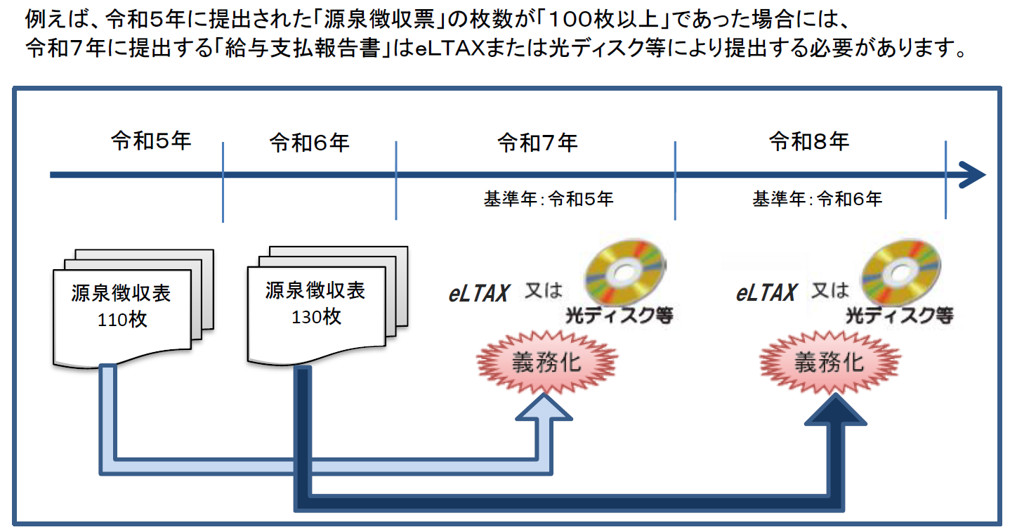 前々年分の税務署へ提出すべきであった源泉徴収票の枚数が100枚以上であった場合は、市役所に提出する給与支払報告書も光ディスク等またはeLTAX(エルタックス)で提出する必要があります。