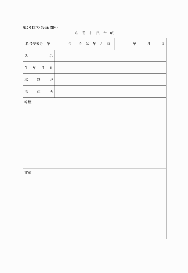 第4条 名誉市民が決定したときは、名誉市民台帳(第2号様式)にその者の氏名、事績の概要その他必要な事項を記録整理しておかなければならない。