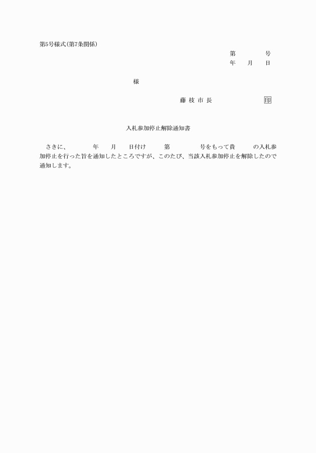6 市長は、入札参加停止の期間中の有資格業者が当該事案について責めを負わないことが明らかになったと認められるときは、当該有資格業者について入札参加停止を解除するものとする。