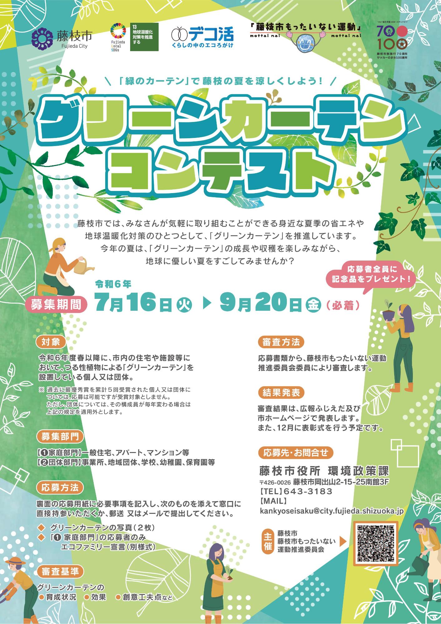 藤枝市では、成長や収穫を楽しみながら、更に省エネもできる「グリーンカーテン」を多くの皆さんに実践していただくため、今年度も「グリーンカーテンコンテスト」を実施し、家庭部門に14件、団体部門に9件の応募をいただきました。ご応募いただいた皆さんは、「グリーンカーテン」を設置することで、植物を育てる喜びや、特に西日対策として室内を涼しくする工夫を楽しんで実践されていました。